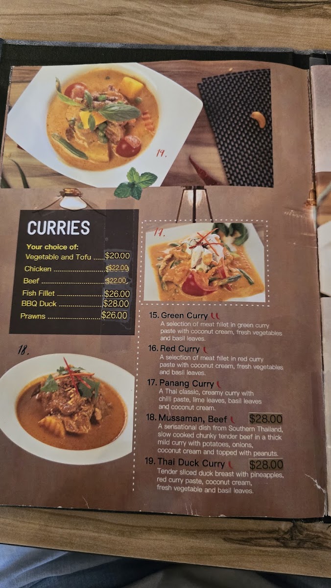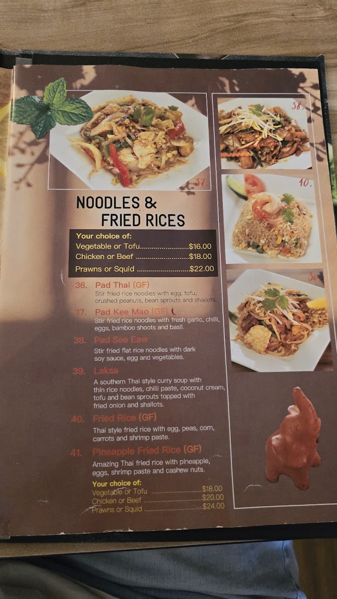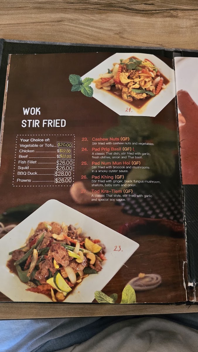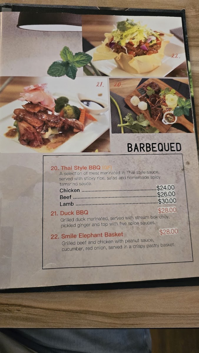 The menu at Smile Elephant Thai Restaurant offers an extensive selection of traditional Thai dishes, perfect for any craving. The Wok Stir Fried section features delicious options like Pad Num Mun Hoi and Cashew Nuts, with dishes like Pad Puk and Pra Ram Long Song providing great variety. For those craving something light, the Thai Salads, including the refreshing Thai Salad, are perfect. The Soups menu includes favorites like the spicy Tom Yum and the creamy Tom Kha coconut soup. The restaurant’s Signature Dishes are particularly noteworthy, with offerings like the flavorful Pla Lard Prig, the Smile Elephant Basket, and the rich Thai Duck Curry. If you're in the mood for noodles or fried rice, try the Pad Kee Mao, Pineapple Fried Rice, or the aromatic Laksa. There are also plenty of Entrée options such as the crispy Peek Gai Tod (6 pieces) and the savory Satay Beef or Chicken (4 pieces). Vegetarians and vegans are well-catered for with choices like Tow Hu Tod (12 pieces) and Vegan Puffs (4 pieces). The Curries menu is a highlight, with staples like Green Curry, Mussaman, and Red Curry, alongside the indulgent Thai Duck Curry. Seafood lovers can indulge in Snow Pea Seafood and the grilled Chu-Chee Grilled Salmon. For sides, you can enjoy the fragrant Coconut Jasmine Rice, Sticky Rice, or Roti. The Kid's Menu offers kid-friendly options such as Cheese Sticks and Chips and Chicken Nuggets and Chips. Finally, for a true Thai BBQ experience, don’t miss the Duck BBQ or the signature Smile Elephant Basket. The menu at Smile Elephant offers a delightful journey through Thai cuisine, with dishes to suit every taste and preference.