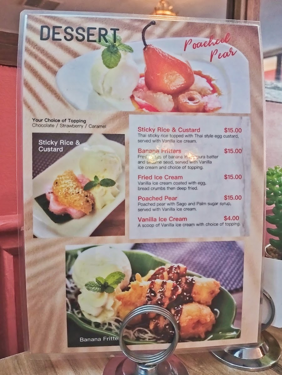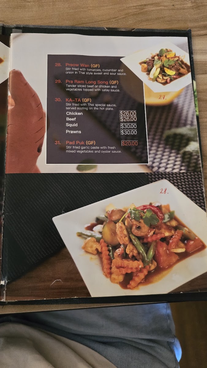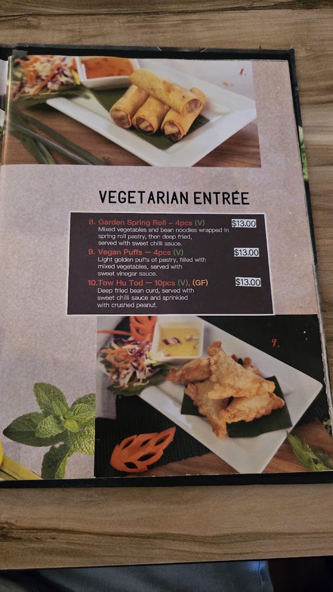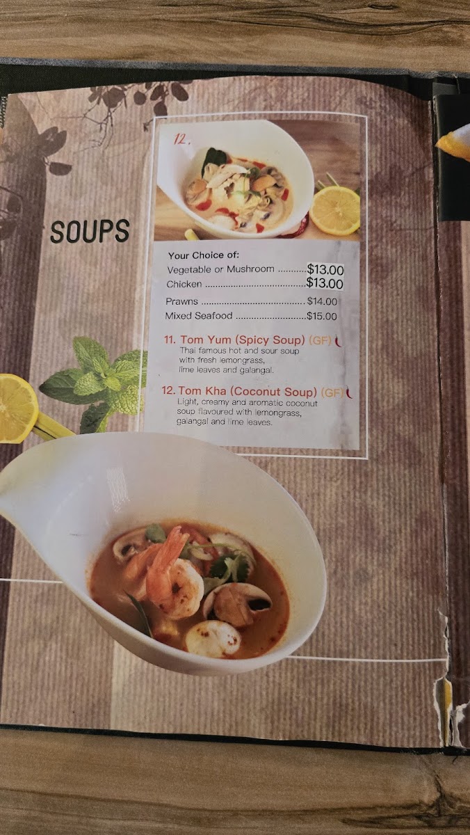 The menu at Smile Elephant Thai Restaurant offers an extensive selection of traditional Thai dishes, perfect for any craving. The Wok Stir Fried section features delicious options like Pad Num Mun Hoi and Cashew Nuts, with dishes like Pad Puk and Pra Ram Long Song providing great variety. For those craving something light, the Thai Salads, including the refreshing Thai Salad, are perfect. The Soups menu includes favorites like the spicy Tom Yum and the creamy Tom Kha coconut soup. The restaurant’s Signature Dishes are particularly noteworthy, with offerings like the flavorful Pla Lard Prig, the Smile Elephant Basket, and the rich Thai Duck Curry. If you're in the mood for noodles or fried rice, try the Pad Kee Mao, Pineapple Fried Rice, or the aromatic Laksa. There are also plenty of Entrée options such as the crispy Peek Gai Tod (6 pieces) and the savory Satay Beef or Chicken (4 pieces). Vegetarians and vegans are well-catered for with choices like Tow Hu Tod (12 pieces) and Vegan Puffs (4 pieces). The Curries menu is a highlight, with staples like Green Curry, Mussaman, and Red Curry, alongside the indulgent Thai Duck Curry. Seafood lovers can indulge in Snow Pea Seafood and the grilled Chu-Chee Grilled Salmon. For sides, you can enjoy the fragrant Coconut Jasmine Rice, Sticky Rice, or Roti. The Kid's Menu offers kid-friendly options such as Cheese Sticks and Chips and Chicken Nuggets and Chips. Finally, for a true Thai BBQ experience, don’t miss the Duck BBQ or the signature Smile Elephant Basket. The menu at Smile Elephant offers a delightful journey through Thai cuisine, with dishes to suit every taste and preference.