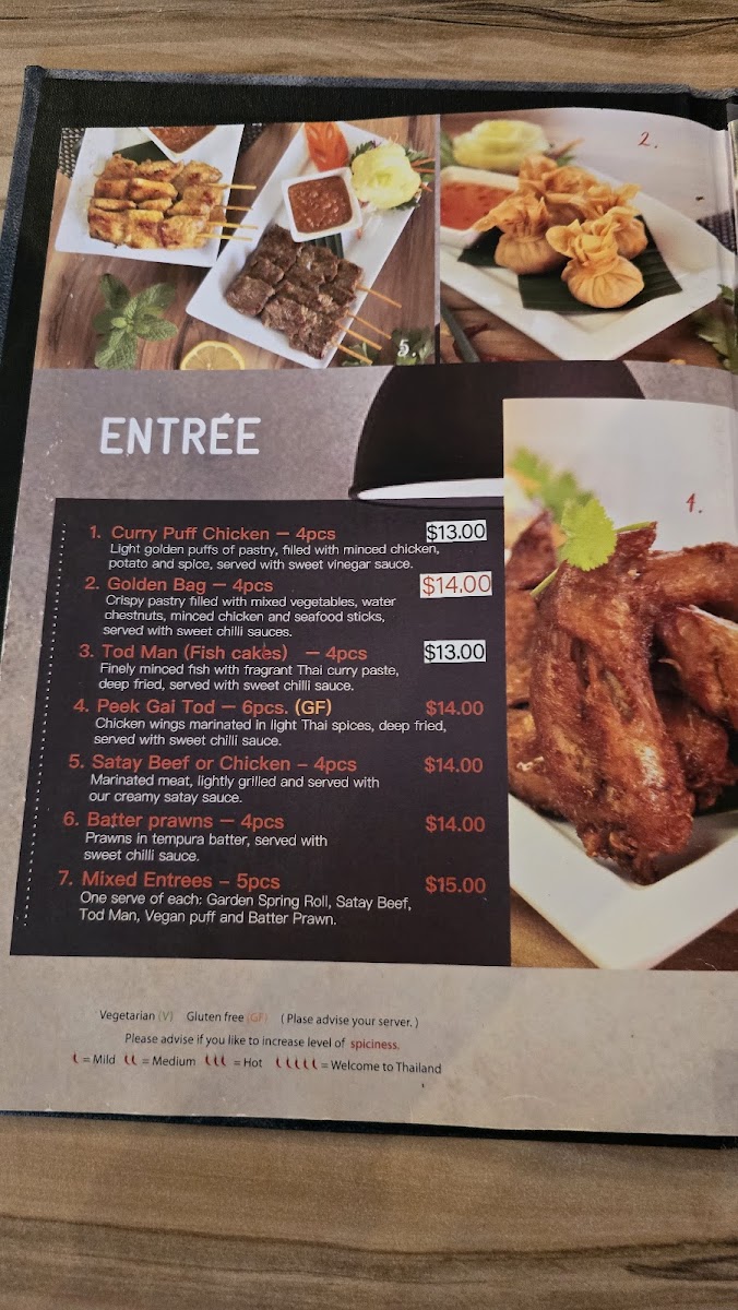 Gluten-free. Chicken wings marinated in light Thai spices, deep-fried, served with sweet chili sauce.