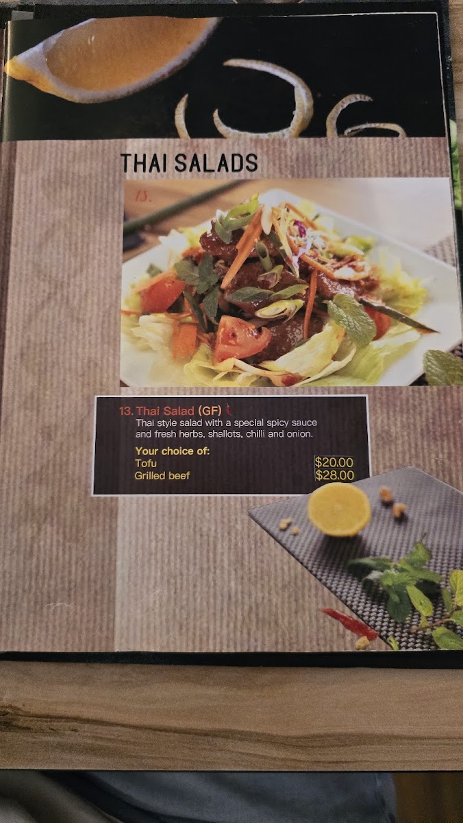 Gluten-free. Thai style salad with a special spicy sauce and fresh herbs, shallots, chili, and onion.